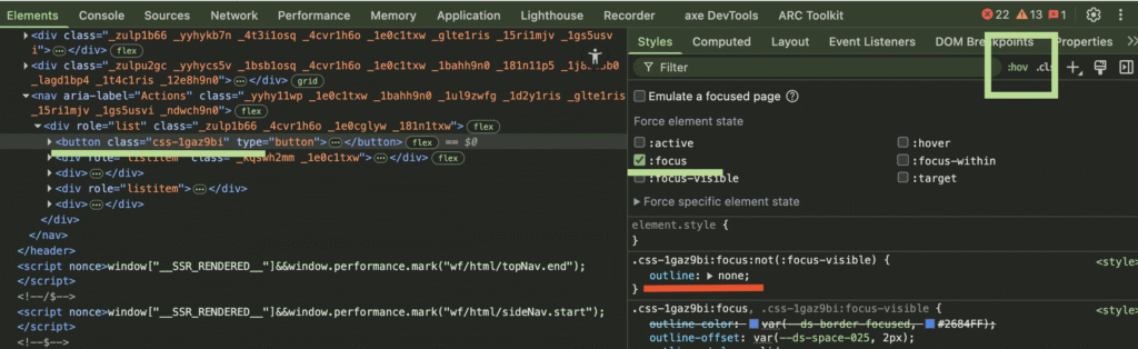 Open de Inspector, klik op een element dat geen focus heeft, klik op de knop met “:hov” en vervolgens op een checkbox naast het label “:focus”. De boosdoener is de code ‘outline:none’. Hiermee is de standaard browserfocus verwijderd.